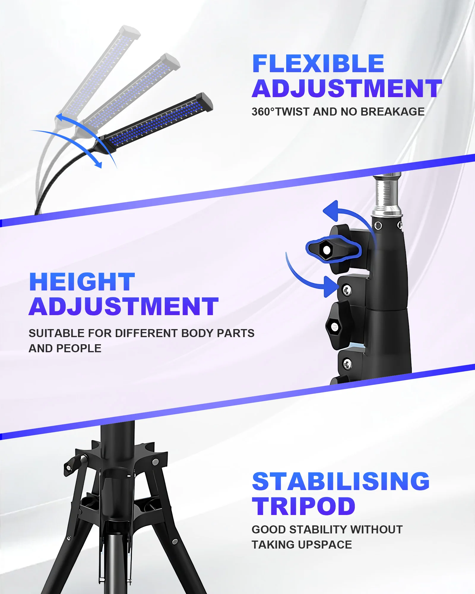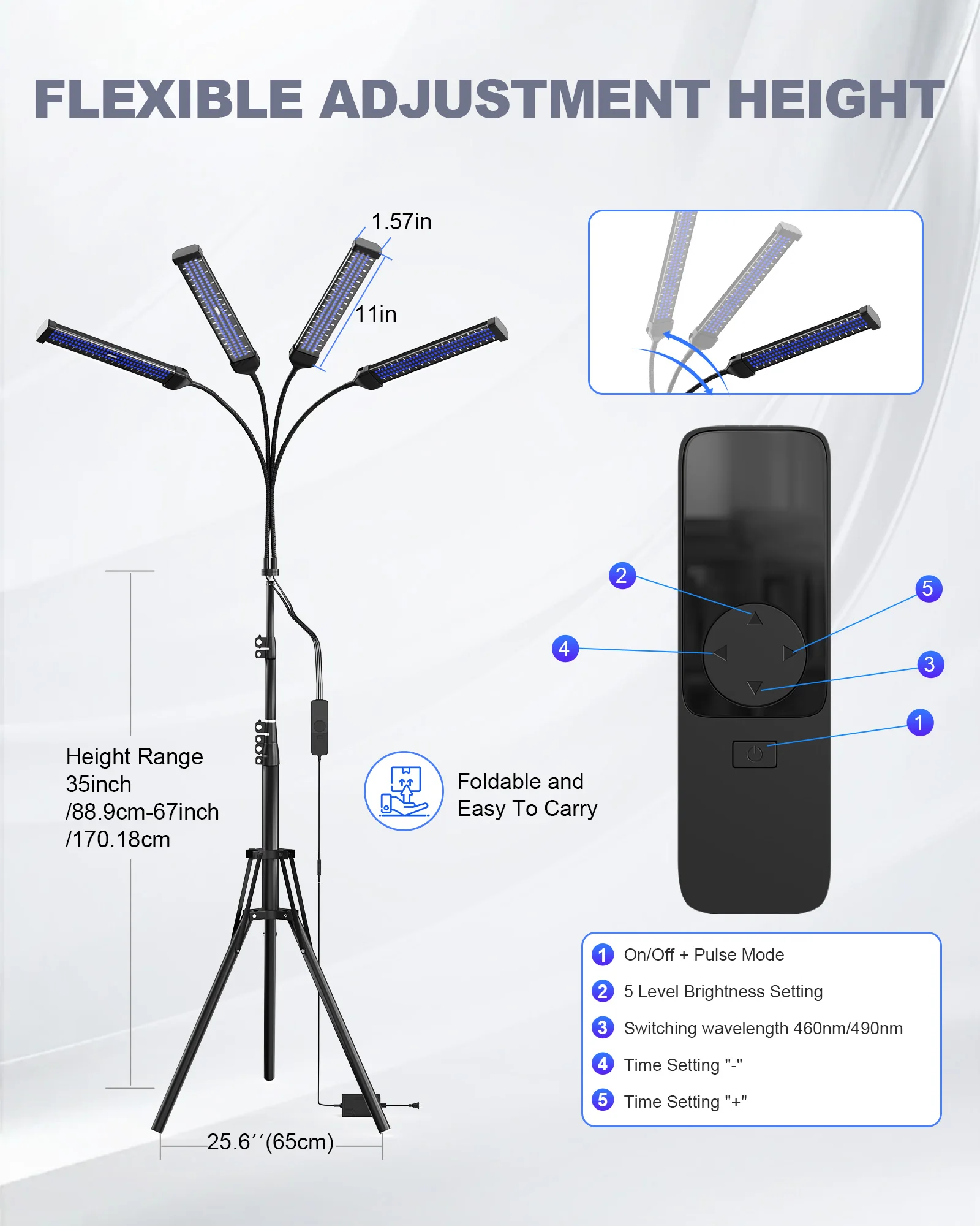 • ADJUSTABLE STAND DESIGN: The height and angle of the lamp base can be freely adjusted according to your needs. Height adjustment range: 15 inches to 61 inches.