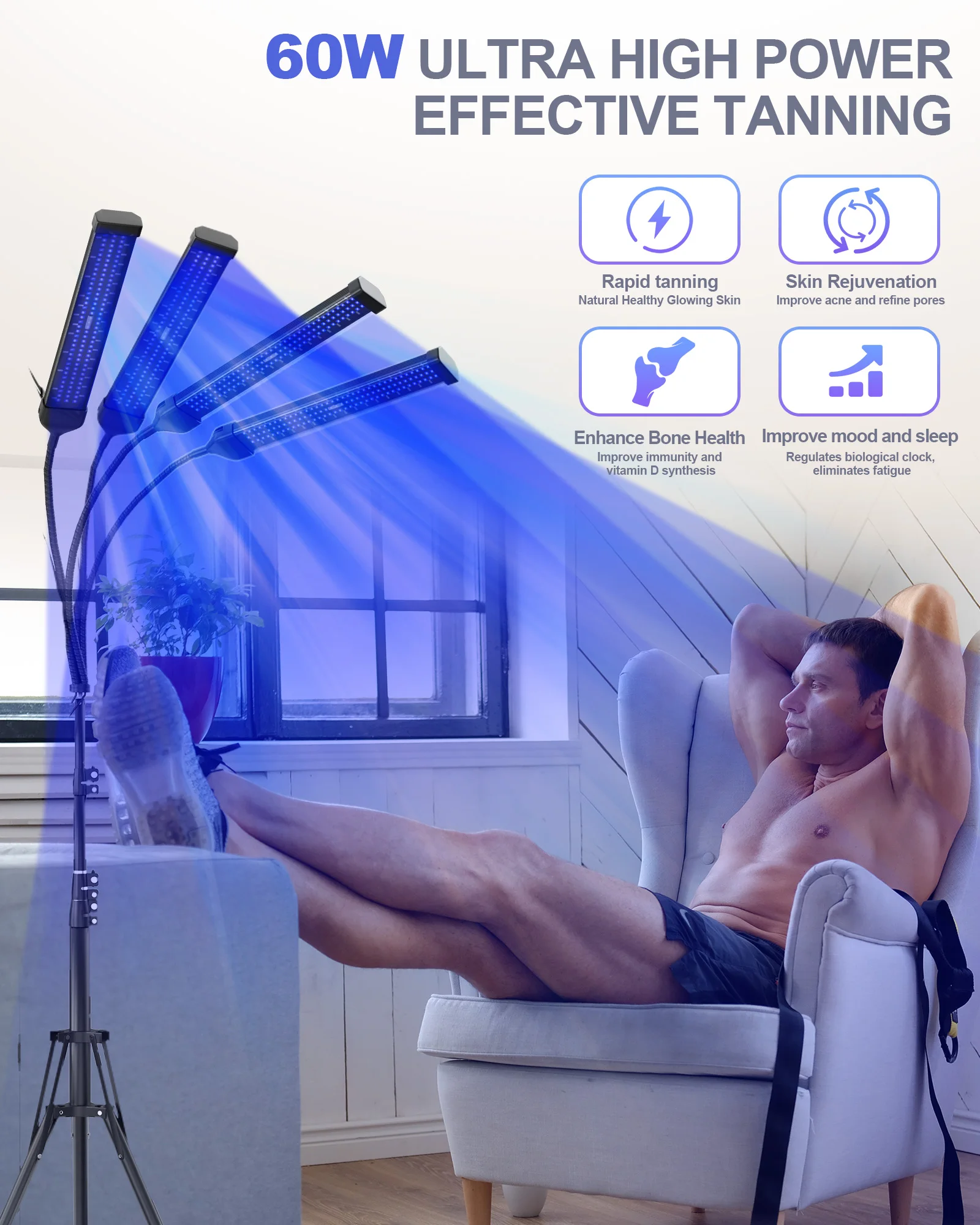 360° Rotation Tanning Machine 60W 4-Head 432 LEDS Blue Light Tanning Lamp Wavelength 460nm & 490nm Solarium Beauty-Health