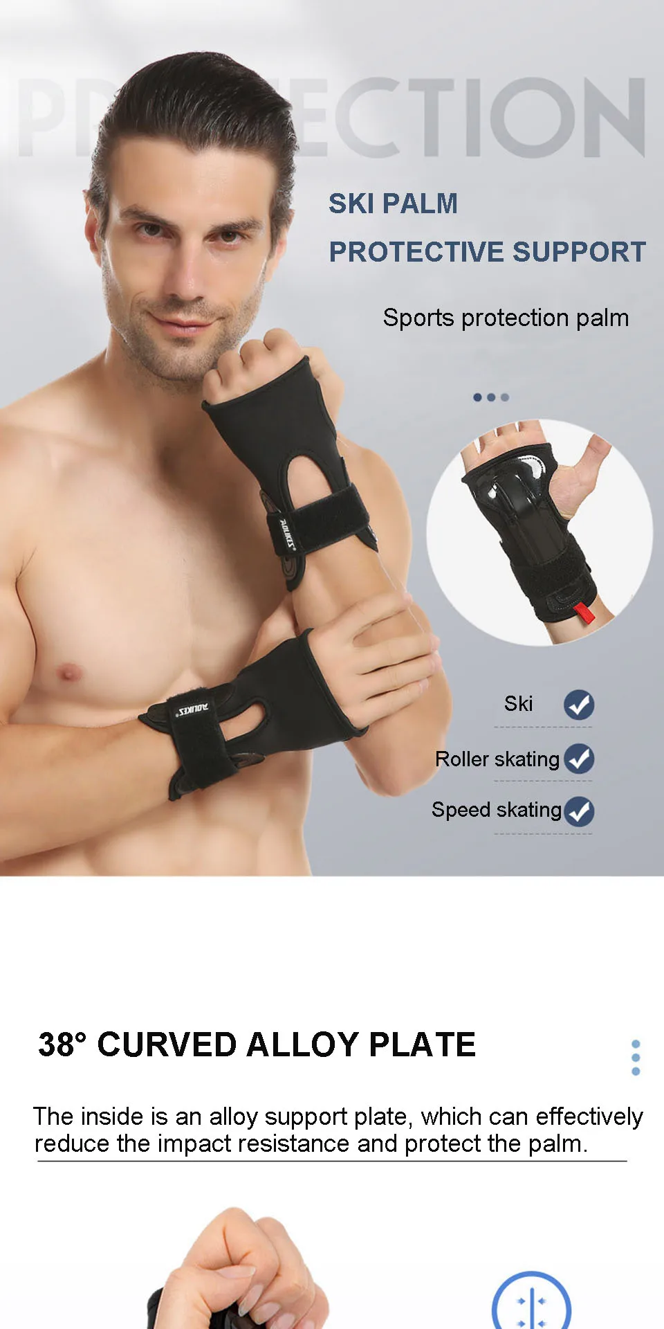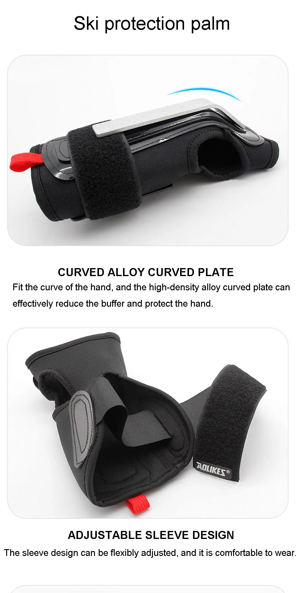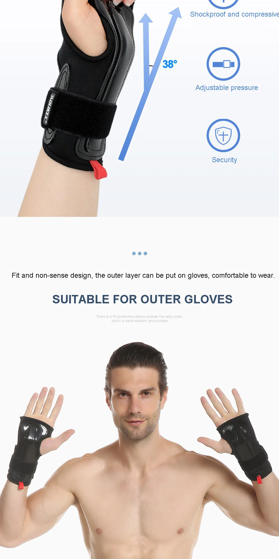 • Can be worn with ski gloves. The wrist guard can be used with ski gloves. It is soft on the outside and rigid on the inside to protect the wrist joints;
