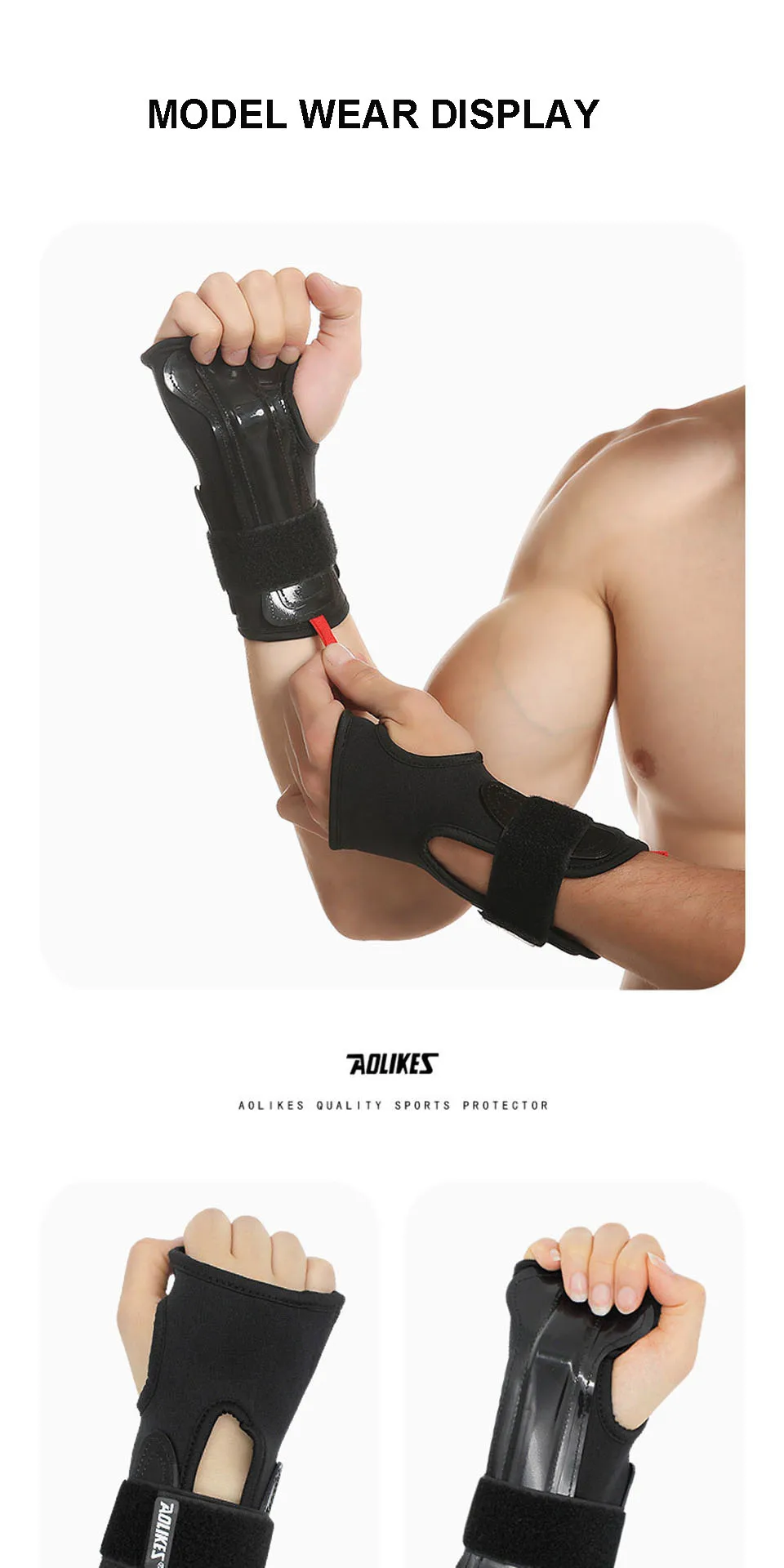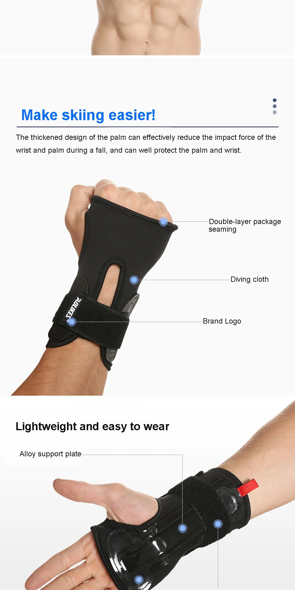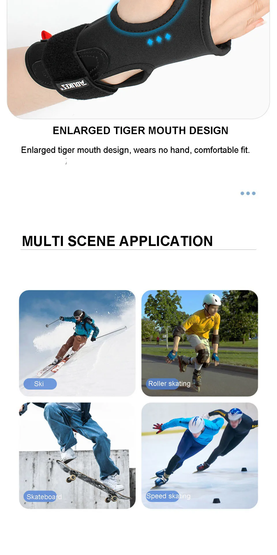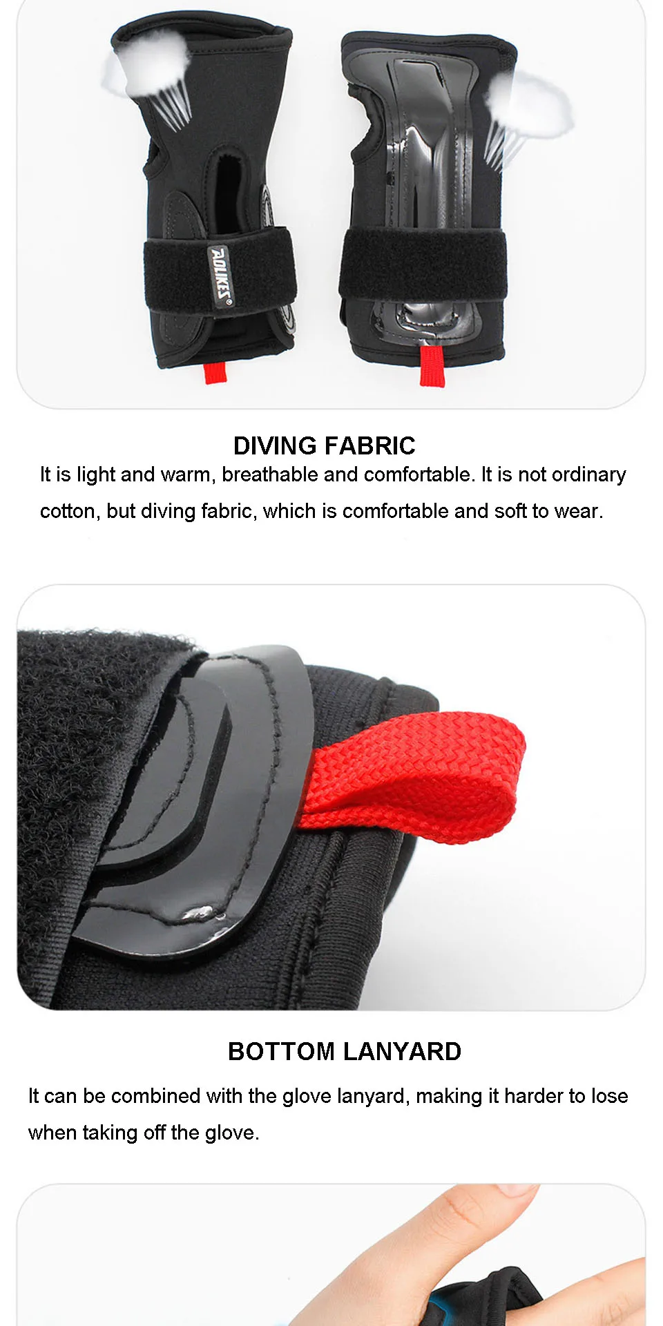 • Can be worn with ski gloves. The wrist guard can be used with ski gloves. It is soft on the outside and rigid on the inside to protect the wrist joints;