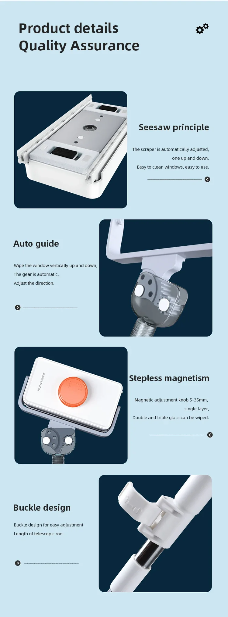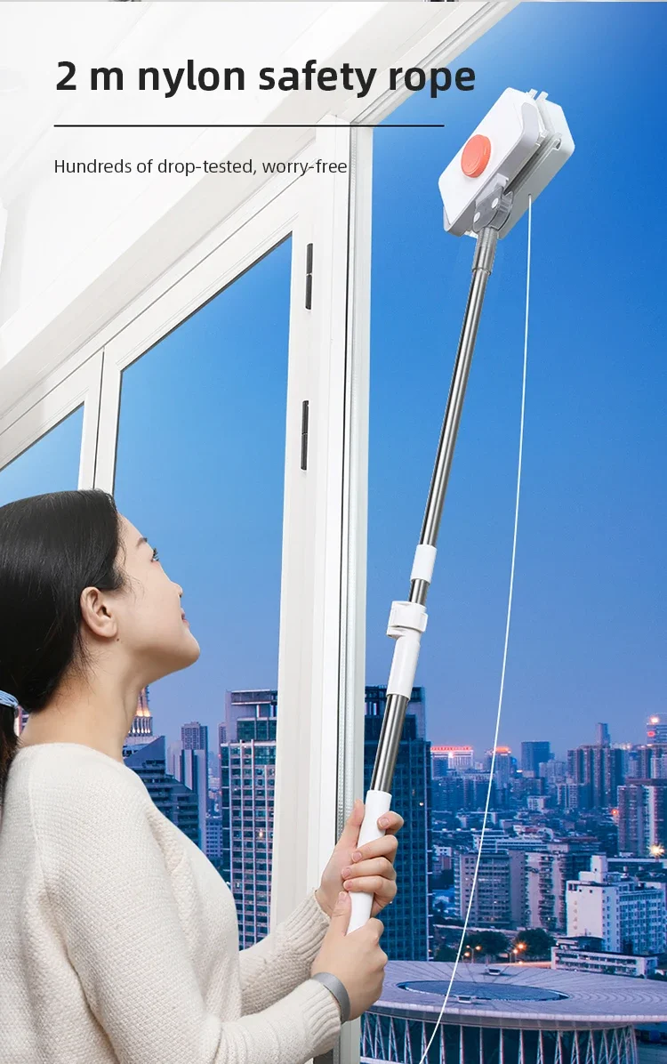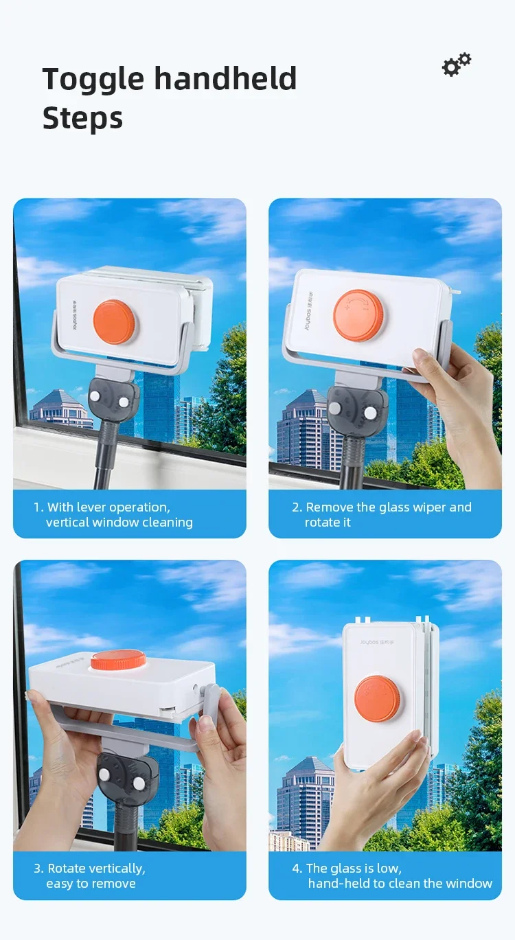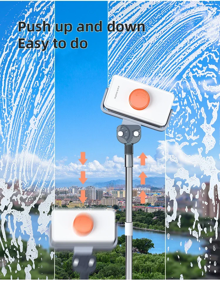 3、Can switch between manual and extended rod cleaning modes at will, the extended telescopic rod can be automatically disassembled, if not disassembled, and use a manual window cleaner for cleaning, suitable for low-rise glass