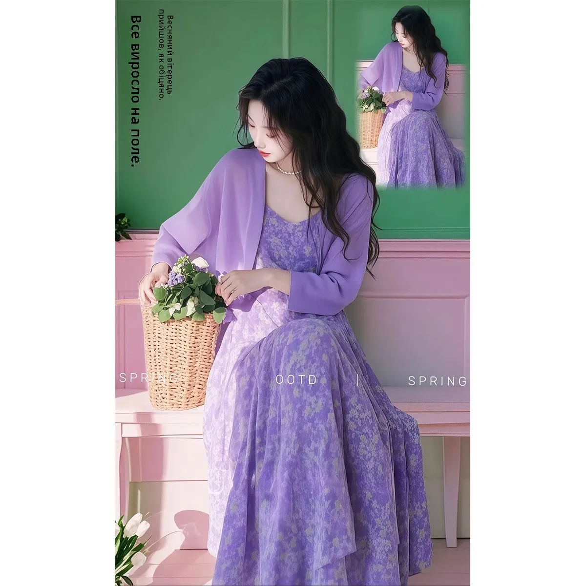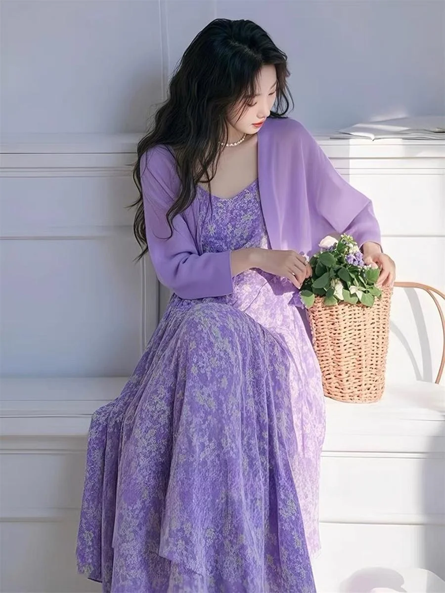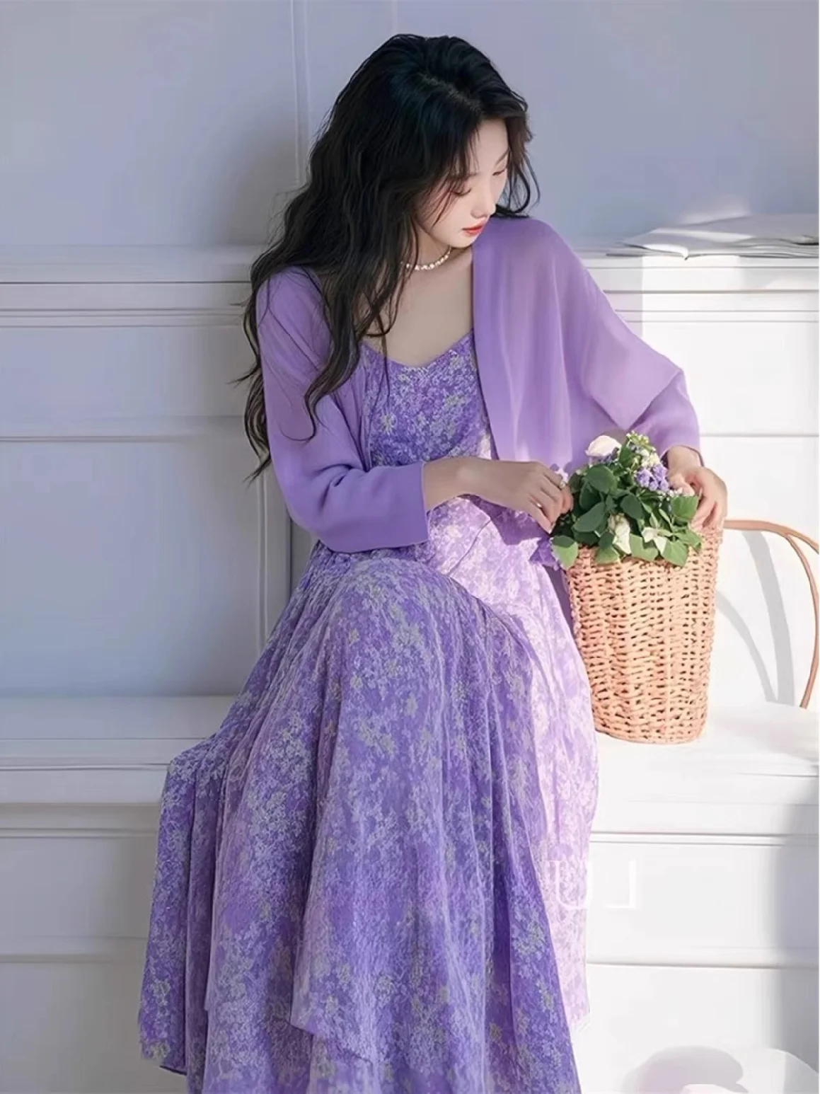 Exude elegance with this purple open-cardigan and floral dress set, perfect for the sophisticated lady.