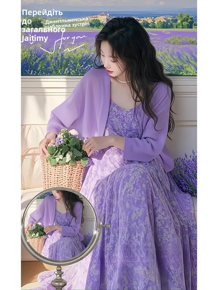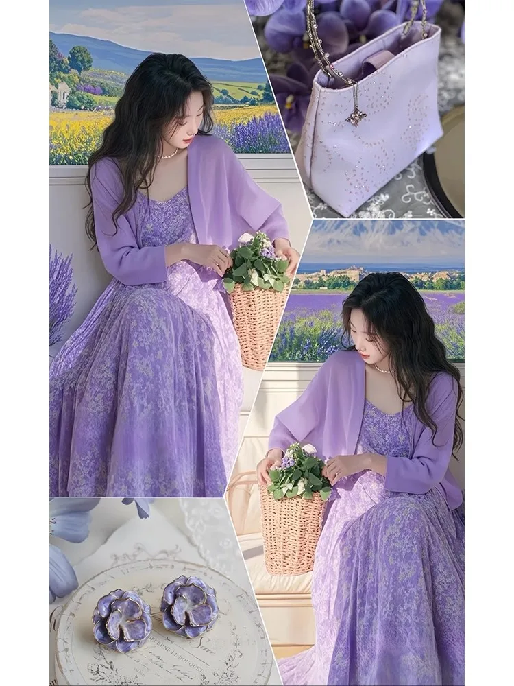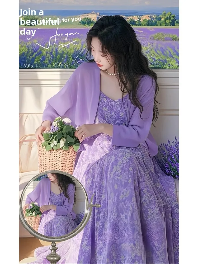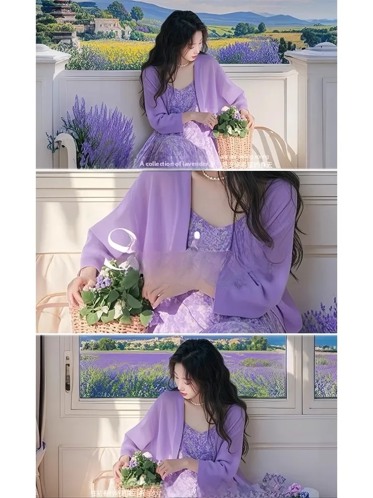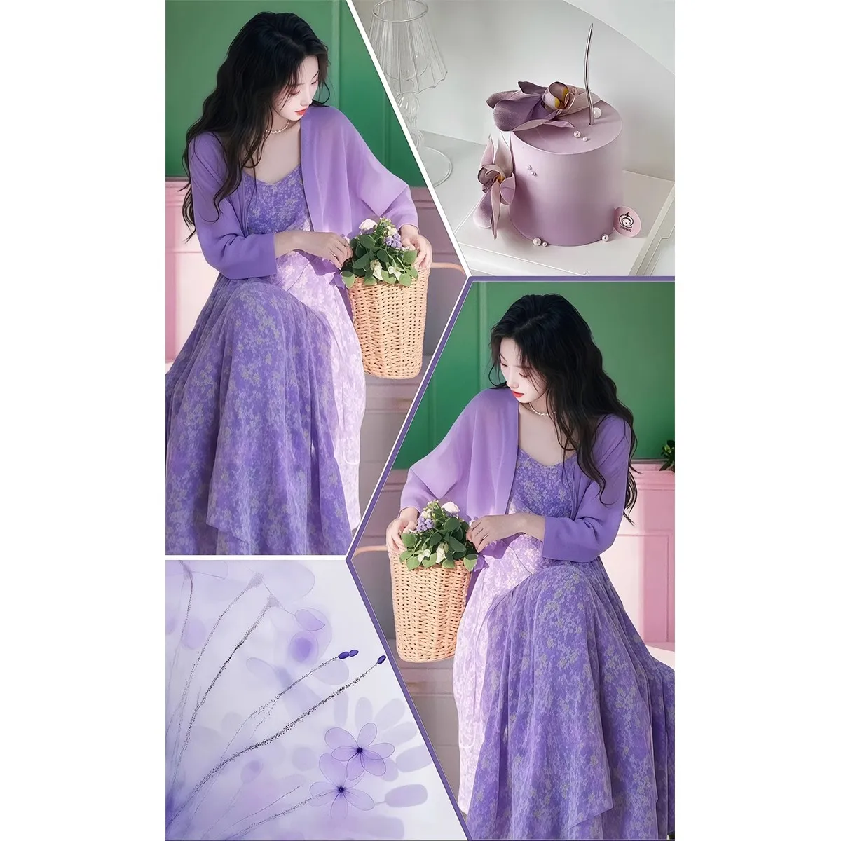 Exude elegance with this purple open-cardigan and floral dress set, perfect for the sophisticated lady.