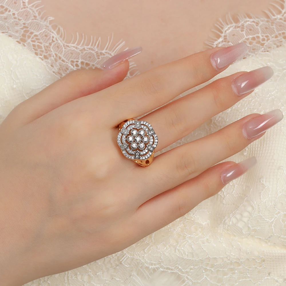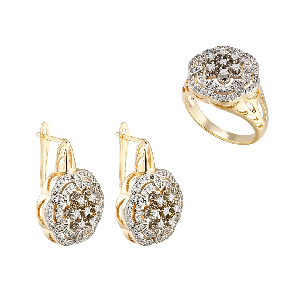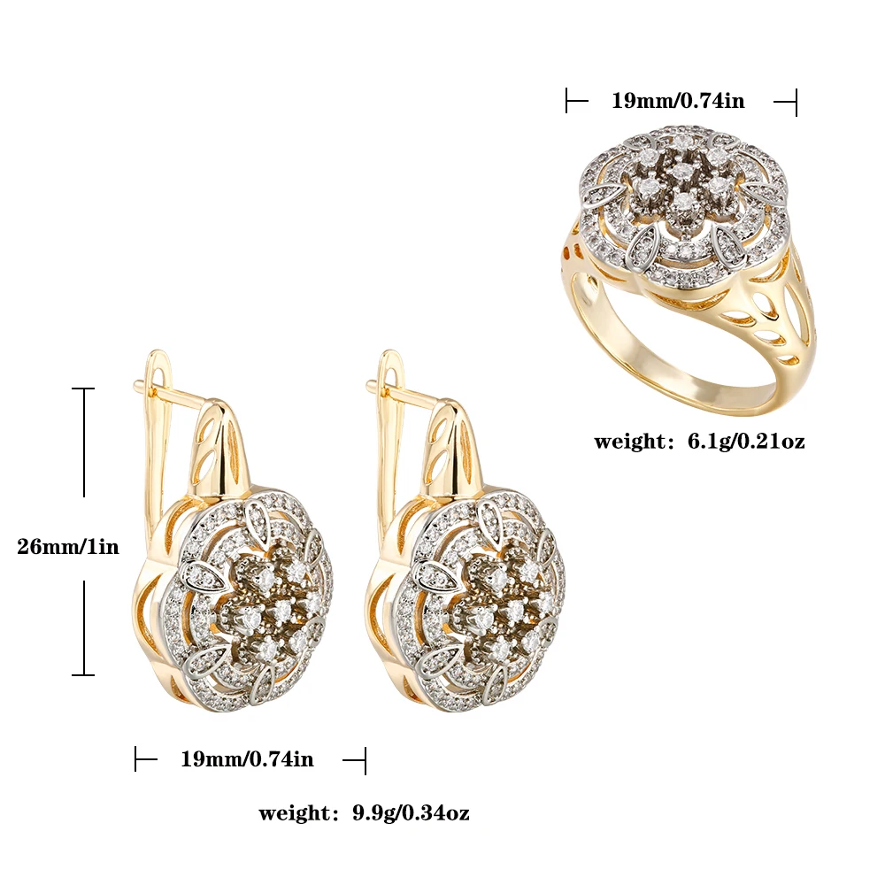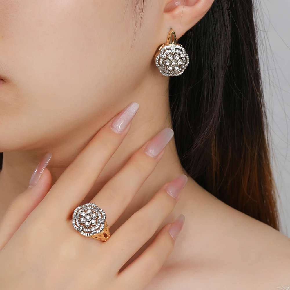 Hollow floral design inlaid zircon earrings set ring copper plated 14K gold fashion jewelry wedding banquet gift accessories