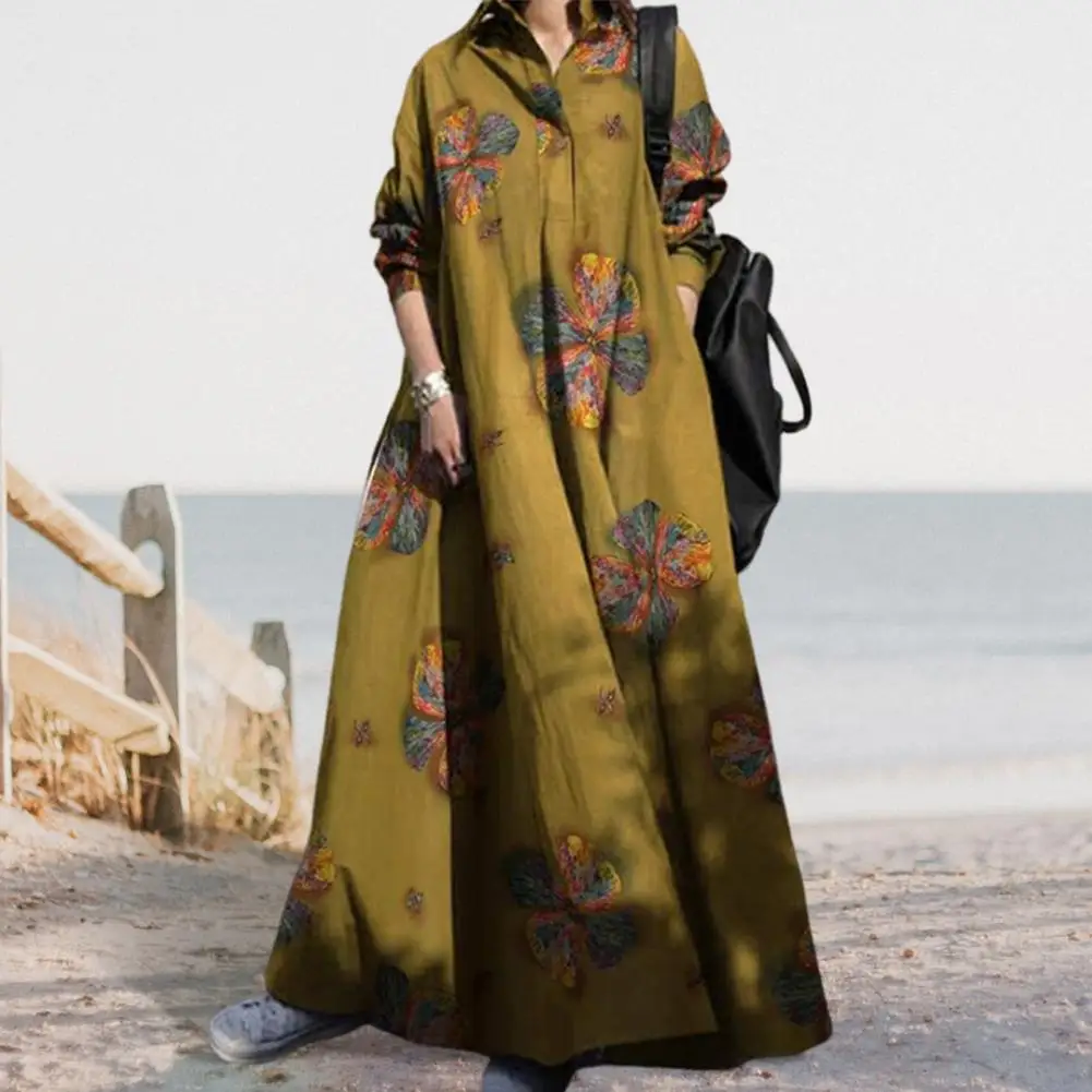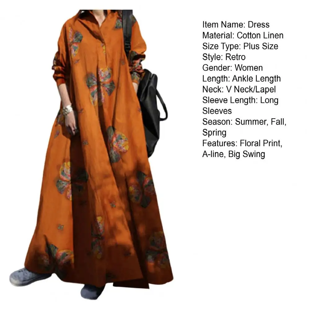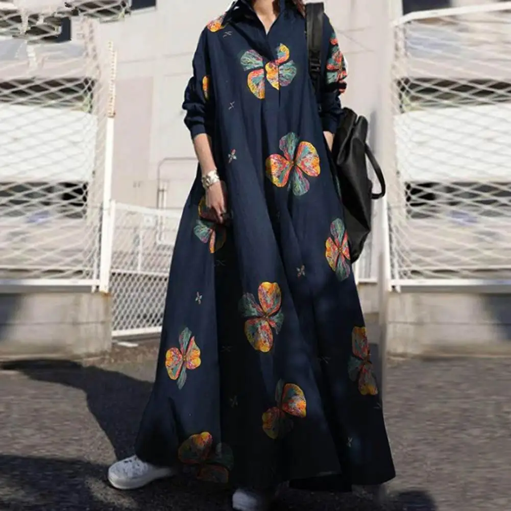 Long Sleeve Dress Floral Print Maxi Dress with Turn-down Collar for Women Ethnic Style A-line Loose Fit Plus Size Ankle Length