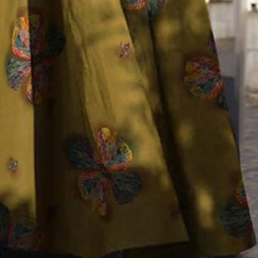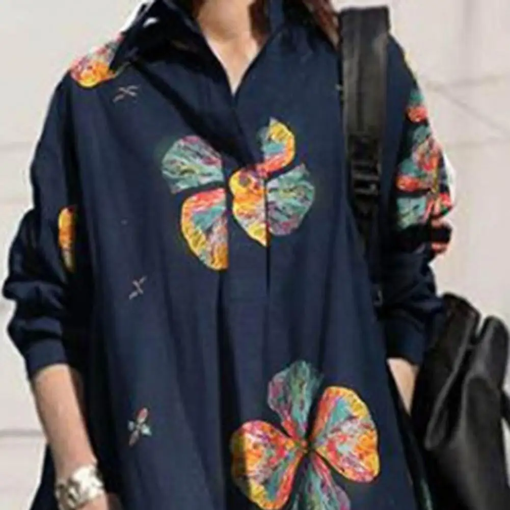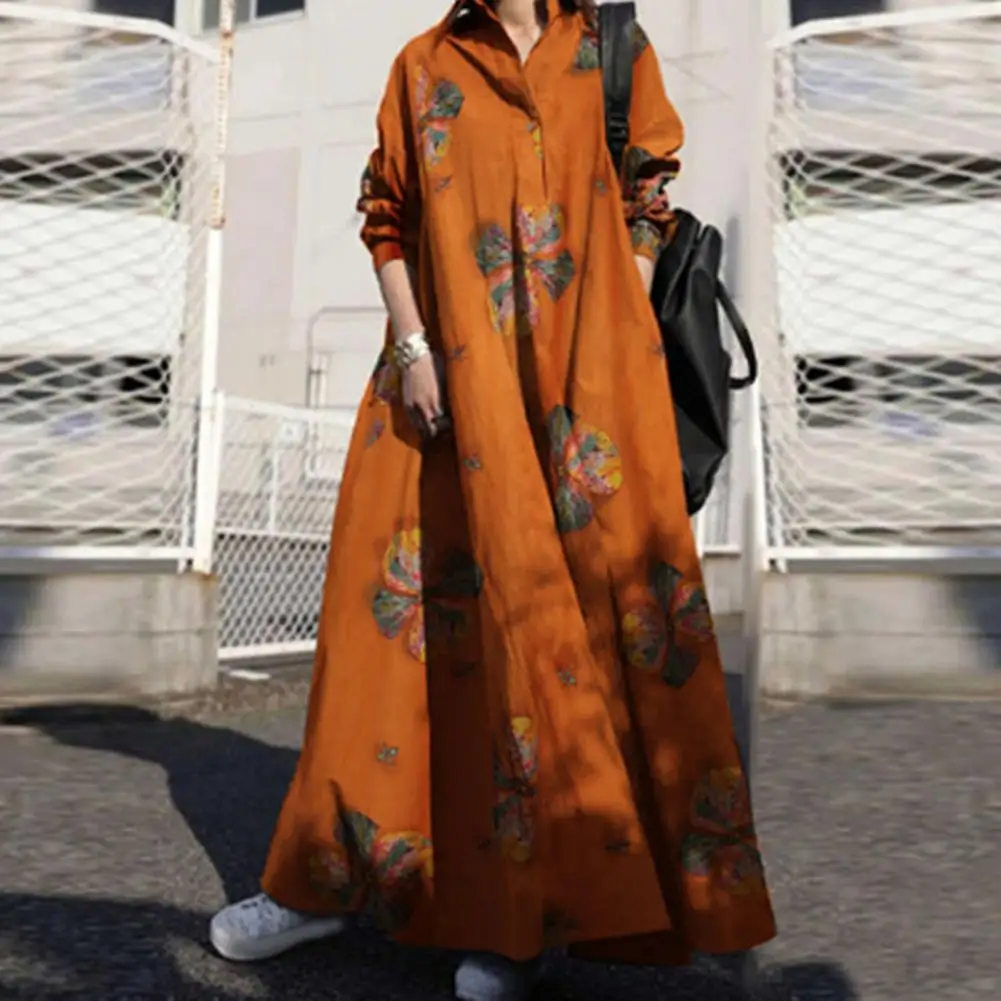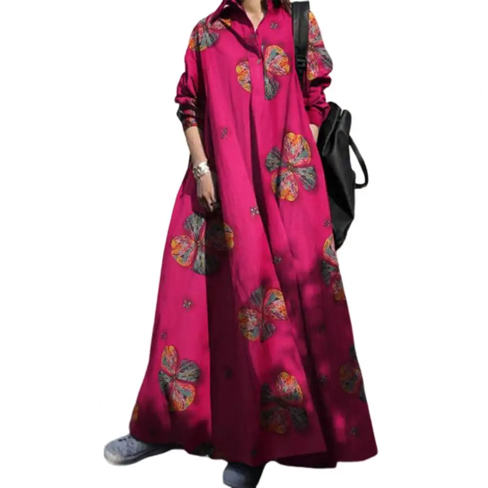 Long Sleeve Dress Floral Print Maxi Dress with Turn-down Collar for Women Ethnic Style A-line Loose Fit Plus Size Ankle Length