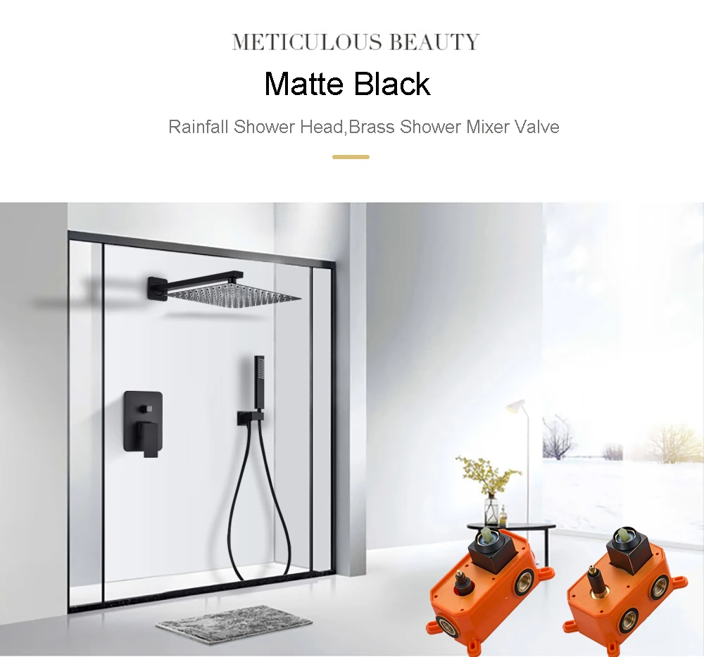 POIQIHY Embedded In Wall Shower Faucet Rainfall Stainless Steel 8/10/12/16″ Shower Head Faucet Shower Tap Mixers Matte Black
