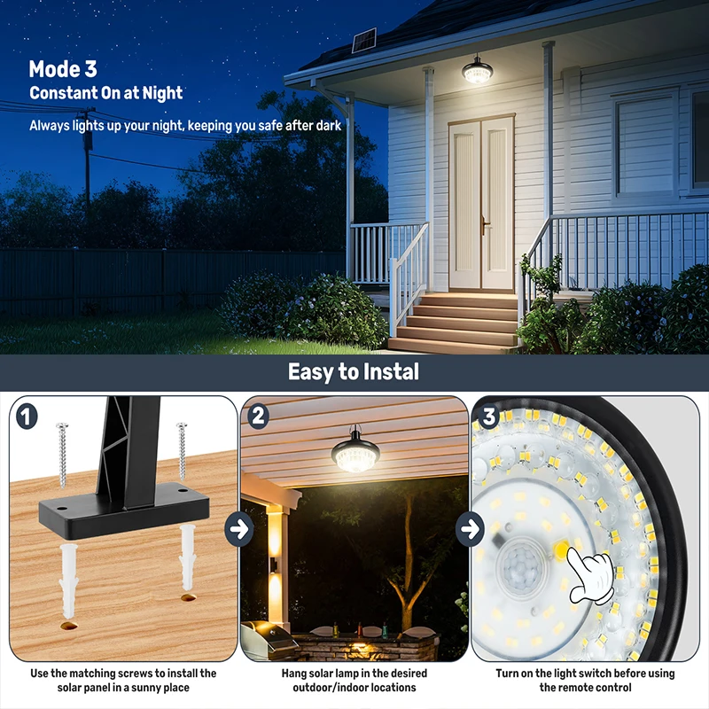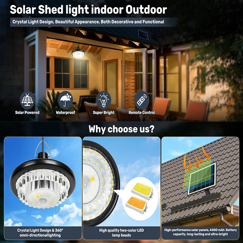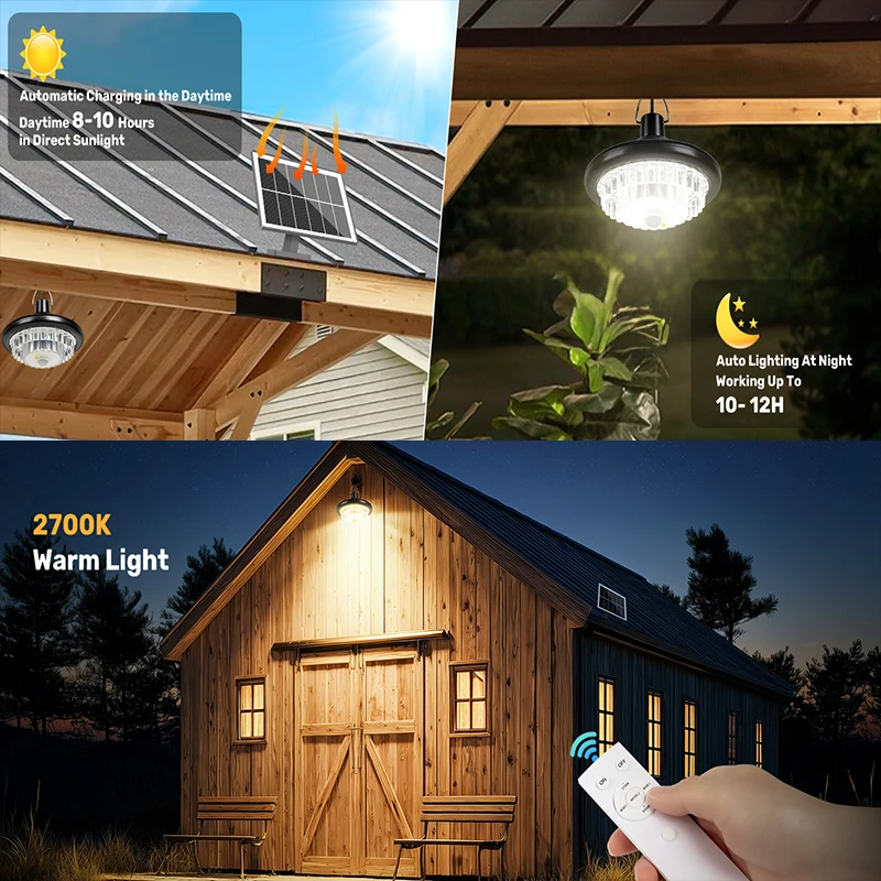 • 【Easy Installation, Versatile Use】- This solar shed light is easy to install, just fix the solar panel outdoors with the included screws and hang the chandelier where you need it.IP65 waterproof design is suitable for any outdoor or indoor space, no wiring required! Ideal for sheds, gazebos, garages, barns, basements, patios, storage rooms and more. (For first time use, please charge it under the sunlight for 5-6 hours, turn on the power button after fully charged and ready to use.)