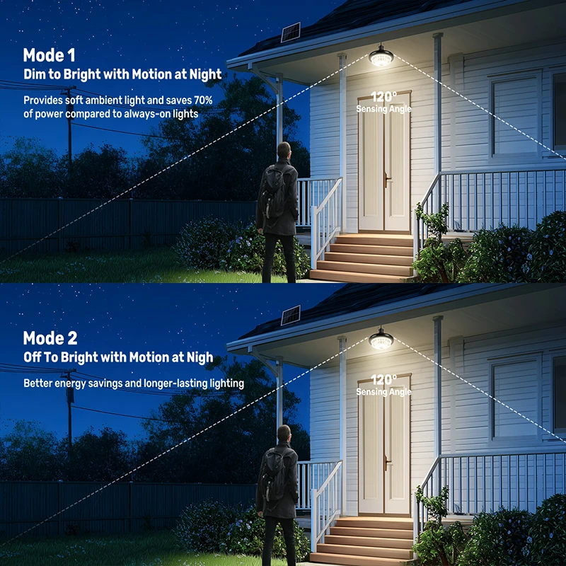 • 【3 Sensor Modes】- The Solar Shed Light has a built-in high sensitivity motion detector and is configured with 3 lighting modes to choose from: Mode 1: Dark to light when motion is detected at night. Mode 2: Lights up at night when motion is detected / goes out 13 seconds after person leaves. Mode 3: Lights up automatically when it gets dark and stays on constantly. Mode switching: 1 Press lamp switch to cycle modes (1→2→3); 2 Use remote control (requires brief lamp switch press first)