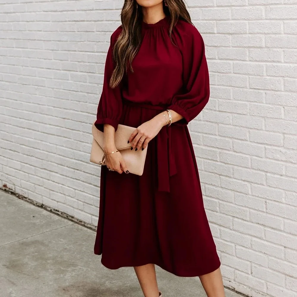 Summer Green Full Sleeve Plain Maxi Dress Blouson Dress Skater Dress Solid Lantern Round Neck Medium Stretch Belted Midi Dress
